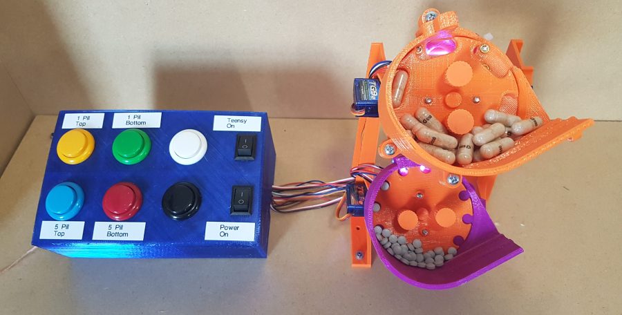 To the left are all of the control buttons. They are big, easy to use arcade style buttons. We designed the pill dispenser to work with two different types of pills. The top was a fiber capsule style pill. On the bottom we used a small sugar pill, similar to many birth control medications. These two pills allowed us to capture a wide range of different pill dimensions without designing for hundreds of different pill types. The disk insert allows us to swap which types of pills the machine can dispense. Designing and printing new disks is a straightforward process.